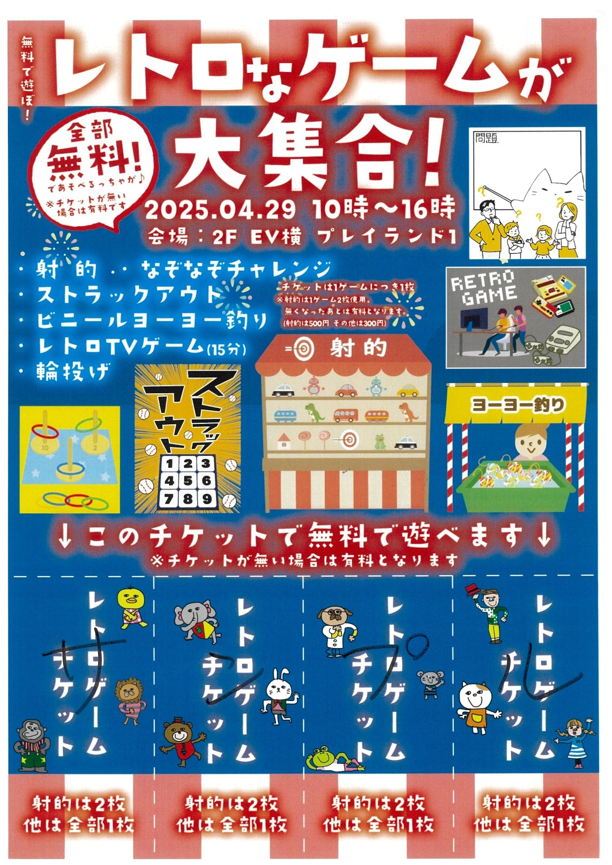 フロントで受付される際に「レトロゲームチケット」(4枚綴り)の付いたチラシをお渡しします。その券を持って2階旧キッズランドの会場に券をお渡しください(この案内の最後にチケットのサンプルを添付しておりますのでご参照ください)。射的は1回で2枚のチケット、その他のゲームは1枚チケットでチャレンジできます。射的以外のゲームなら最高4回ゲームが楽しめます。